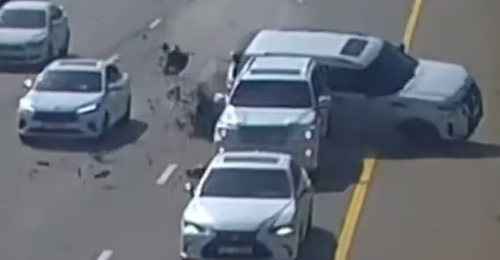 വിഡിയോയിലെ ഒരു ദൃശ്യത്തിൽ മുൻപിലുണ്ടായിരുന്ന വാഹനത്തിന് പിന്നിലേക്ക് അമിതവേഗത്തിൽ വന്ന കാർ ഇടിച്ചുകയറുന്നത് കാണാം. നിയന്ത്രണം വിട്ട കാർ ഇടിച്ചതിനെത്തുടർന്ന് ചങ്ങലപോലെ മറ്റ് വാഹനങ്ങളും ഒന്നൊന്നിന് പിന്നാലെ കൂട്ടിയിടിച്ചു. ഇടിഞ്ഞുവീണ വാഹനഭാഗങ്ങൾ റോഡിലാകെ ചിതറിത്തെറിച്ചതോടെ ട്രാഫിക് പൂർണമായും തടസ്സപ്പെട്ടു. ഇടിച്ച കാറിന്റെ ആഘാതത്തിൽ മുന്നിലുണ്ടായിരുന്ന ഒരു വാഹനം തൊട്ടടുത്ത മറ്റൊരു കാറിന് മുകളിലേക്ക് ഭാഗികമായി കയറിയ നിലയിലായിരുന്നു.